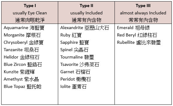 美國寶石學院 (GIA) 跟據內含物普及程度將寶石大致分為三個類別。